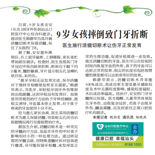 據(jù)了解,安安意外摔倒后,右上前牙磕斷,上唇撕裂,家長(zhǎng)連忙帶她前往就診。檢查時(shí),醫(yī)生發(fā)現(xiàn)其門(mén)牙牙冠近中縱向斜形折斷,斷面位于齦下約2毫米,髓腔暴露,牙片顯示根尖孔呈喇叭狀開(kāi)放,未閉合。