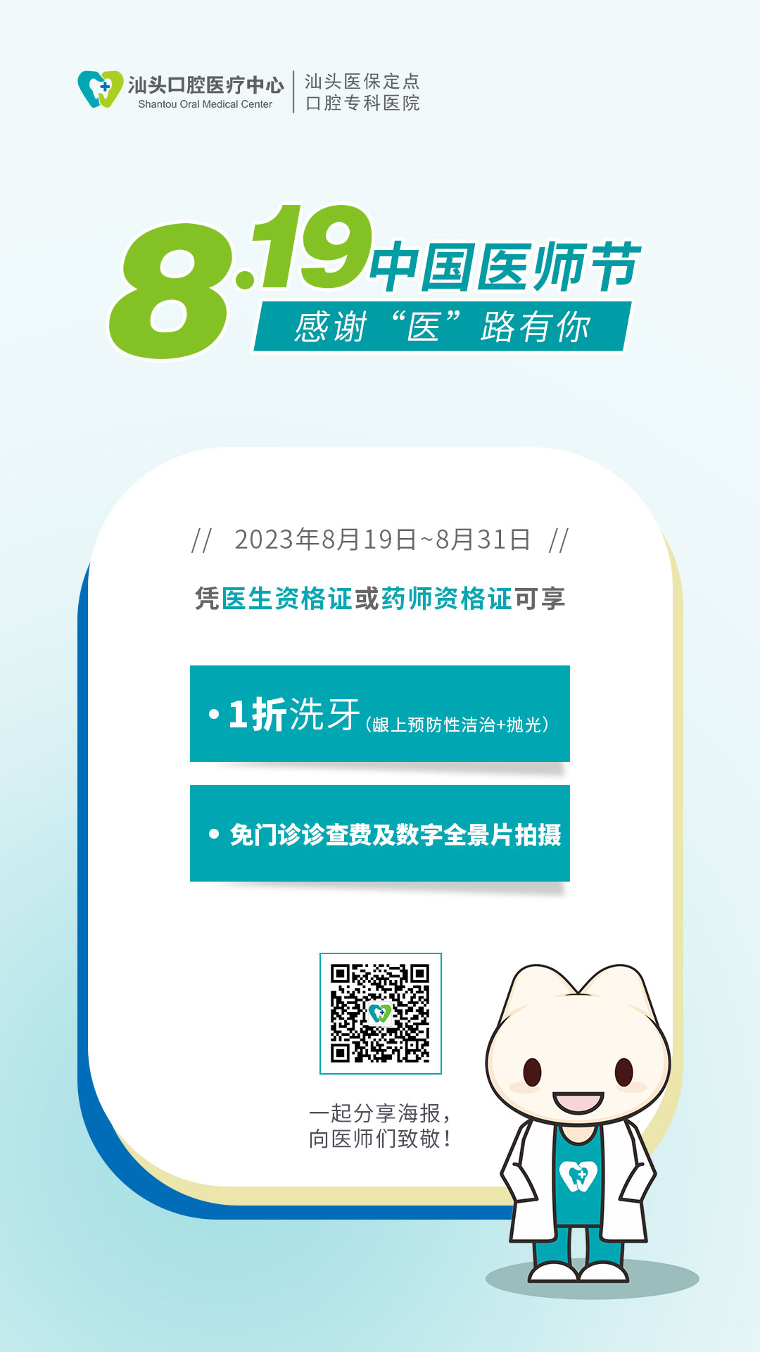 為提高衛(wèi)生健康系統(tǒng)凝聚力,強(qiáng)化社會(huì)尊醫(yī)重衛(wèi)的良好風(fēng)尚,汕頭口腔醫(yī)療中心特為廣大醫(yī)師送上健康福利,感謝守護(hù)健康和生命的你們!