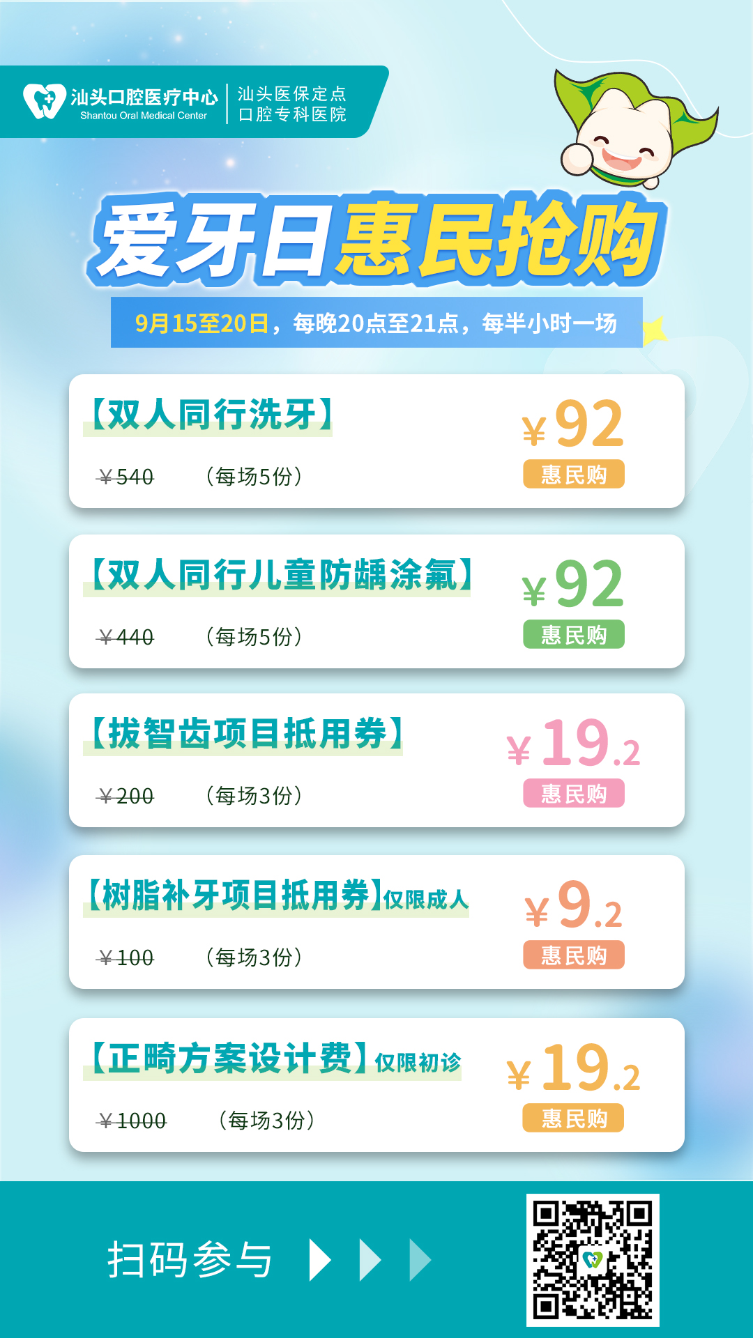 9月15日至9月20日同步開展惠民購,連續(xù)6天每天開啟1個小時,每半小時一場,惠民購項目包含潔牙、兒童涂氟防齲、補牙、拔智齒以及正畸設(shè)計等,可滿足家庭成員的多種口腔健康需求。市民朋友可在微信公眾號進行購買,購買成功即可以惠民價格兌換相應(yīng)的口腔保健項目。以實際行動倡導(dǎo)愛牙健康的生活方式,幫助更多人及早發(fā)現(xiàn)口腔疾患,及時進行科學規(guī)范的治療,共同創(chuàng)造美好的微笑!