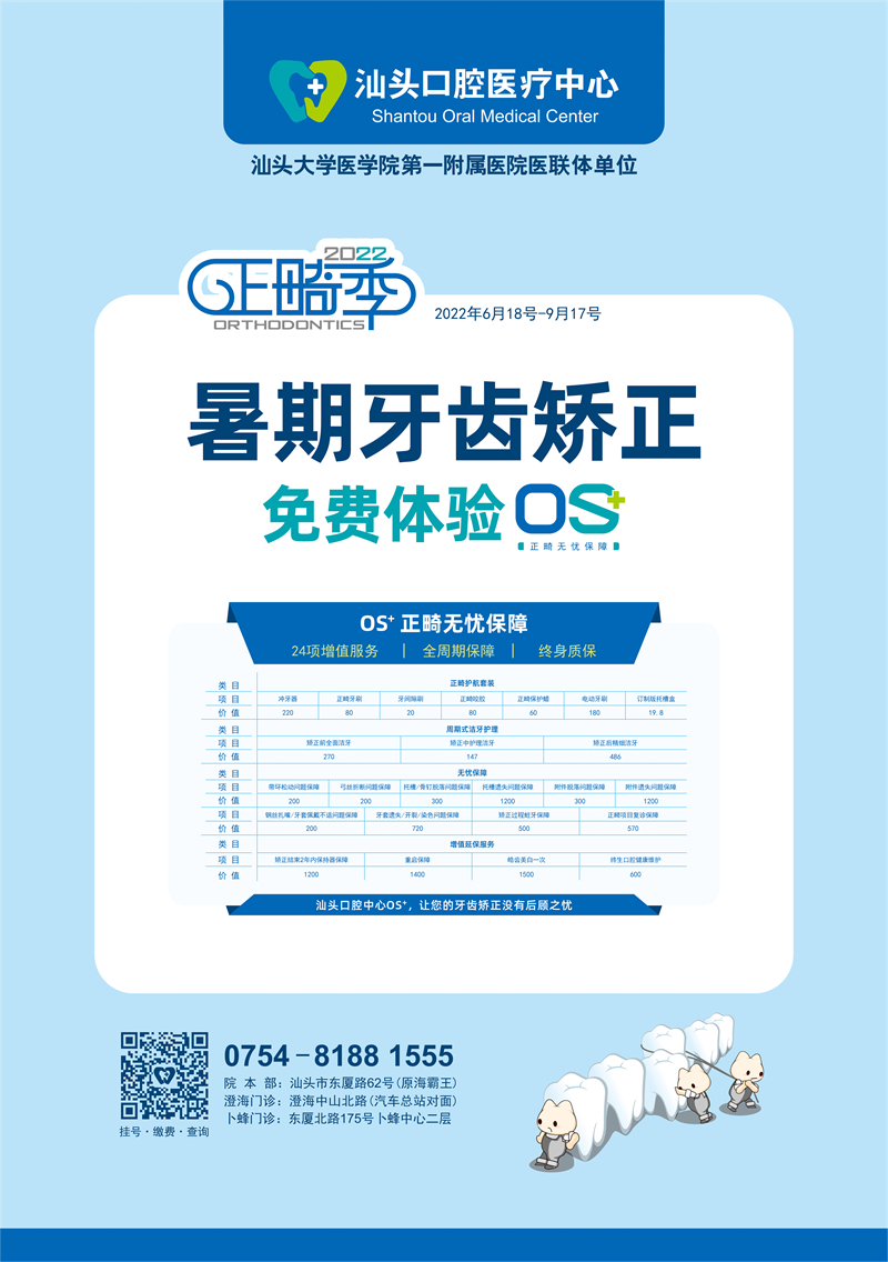 汕頭口腔醫(yī)療中心“OS+正畸無憂保障”增值延保服務(wù),專業(yè)正畸治療+24項(xiàng)增值服務(wù),讓您的牙齒矯正無后顧之憂,價(jià)值上萬元的保障項(xiàng)目,2022正畸季期間簽約即可免費(fèi)體驗(yàn)!