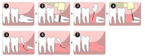 傳統(tǒng)拔牙的流程:局部消毒→麻醉→分離牙齦→劈冠鑿骨→敲錘增隙→挺松牙齒→拔除患牙→棉卷壓迫止血。